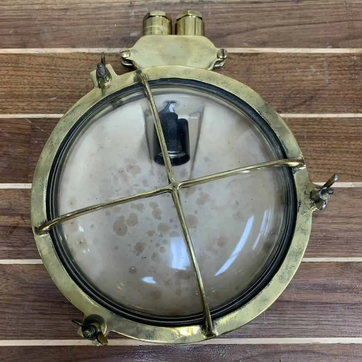 This vintage ceiling light features a solid brass body and a simple cross-bar design. Two brass bars cross at the center of the fixture, giving it a clean, functional look that fits well in nautical or industrial spaces.