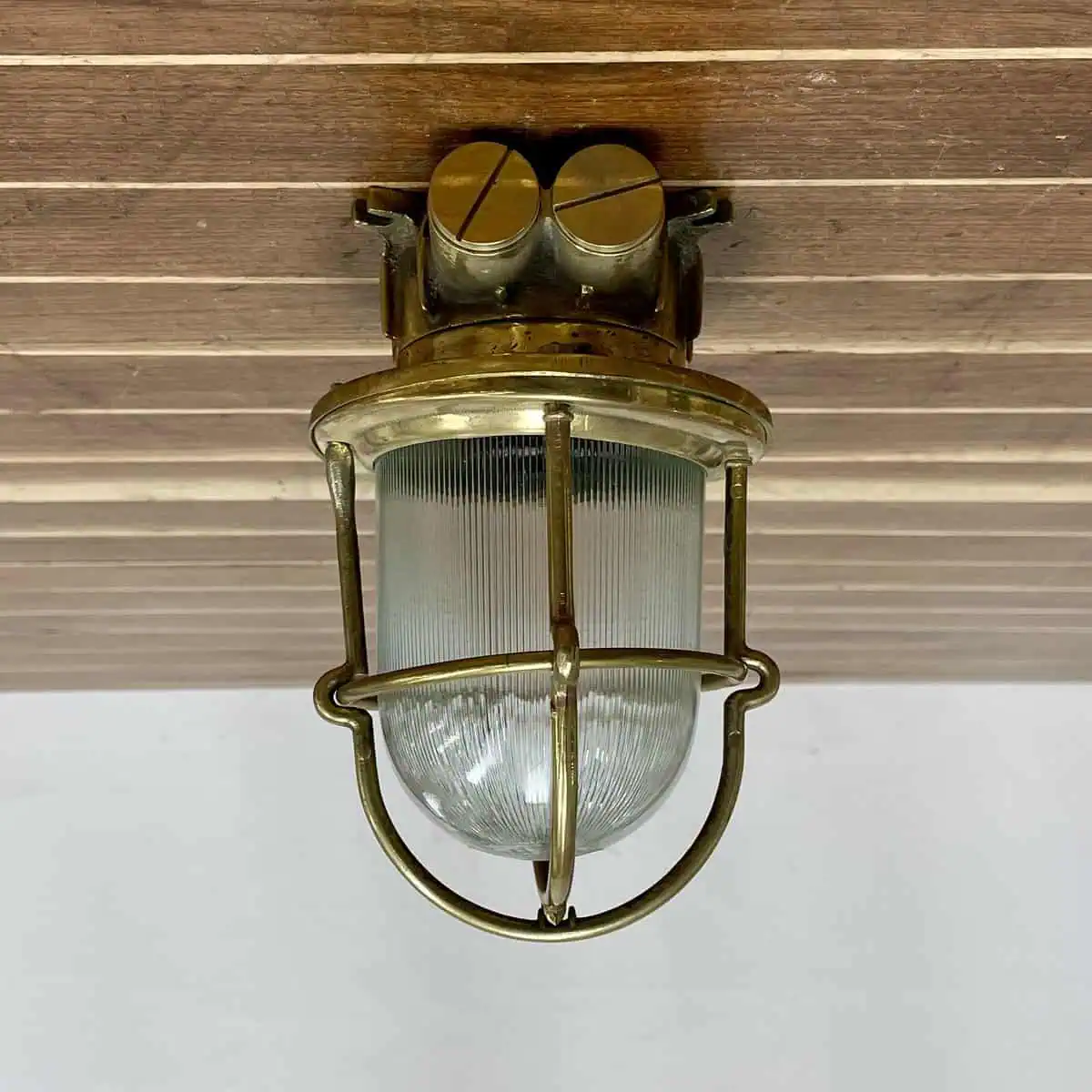 This Nautical Ribbed Glass Ceiling Light was salvaged from a working vessel and restored for modern use. The brass has a polished finish, and the fixture was rewired in-house with UL-listed components. It provides safe, reliable lighting for residential or commercial spaces, and its solid brass construction makes it suitable for both indoor and outdoor installation.