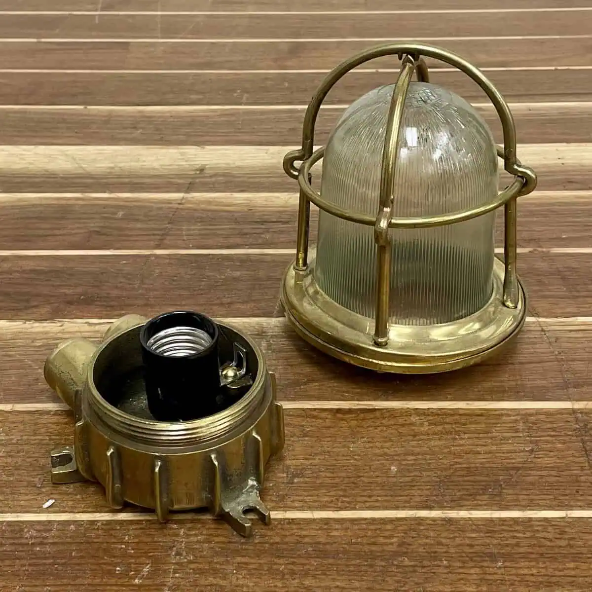 The ribbed glass globe is in good condition and diffuses light with a textured glow. In addition, the protective brass cage keeps the globe secure, while light surface wear on the housing adds authentic nautical character. For convenience, you can twist the cage off the base to access the socket quickly.