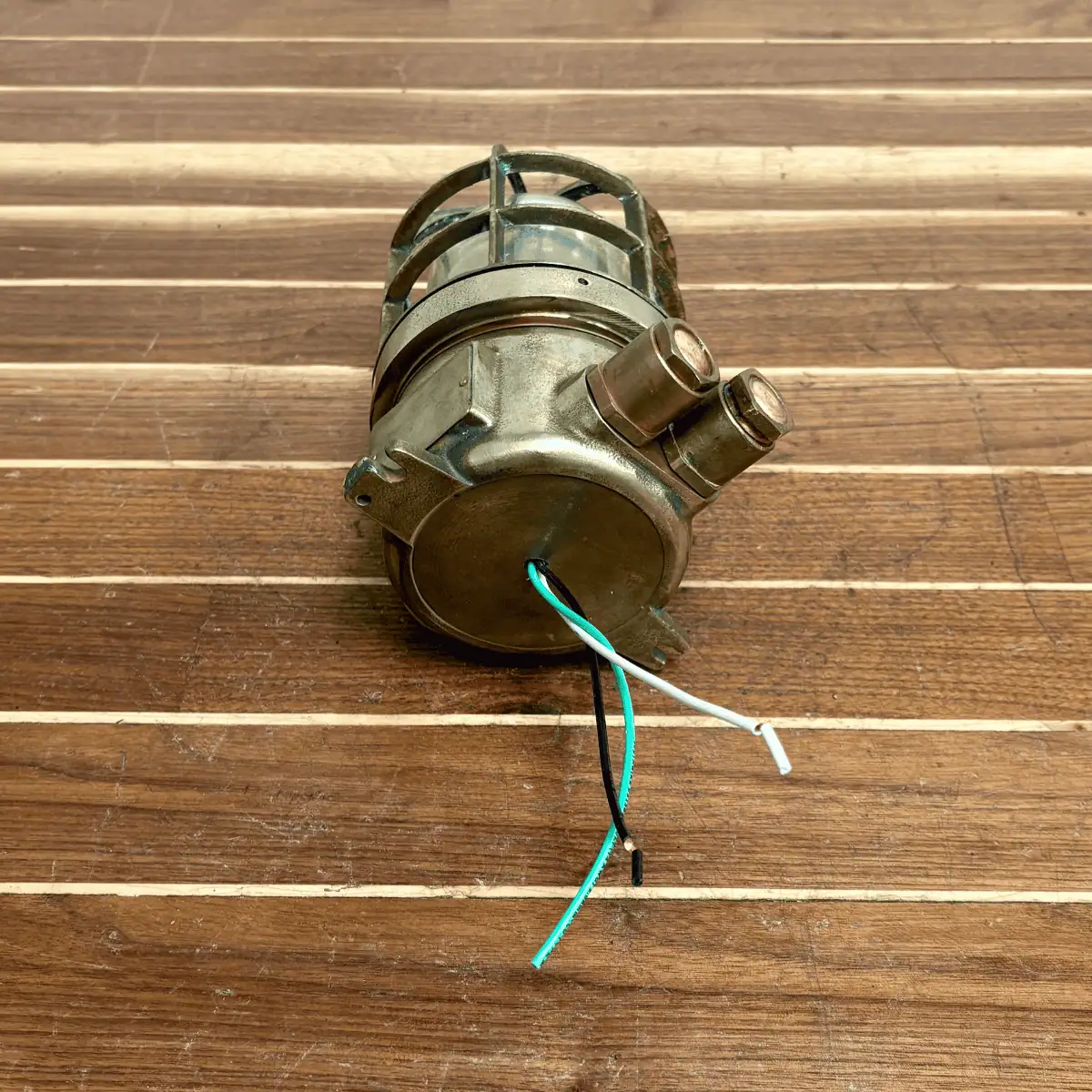 The fixture keeps its industrial marine design and includes two original conduit openings that are now plugged. As a result, surface wear, patina, and glass imperfections clearly show authentic maritime salvage.