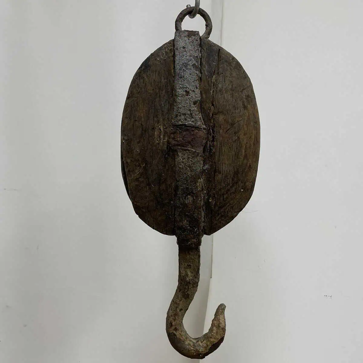 This pulley no longer functions for lifting, but it works great as display décor. Use it in a maritime-themed space, an industrial build, or a vintage tool collection. The raw rusting and aged surfaces add character without needing restoration.
