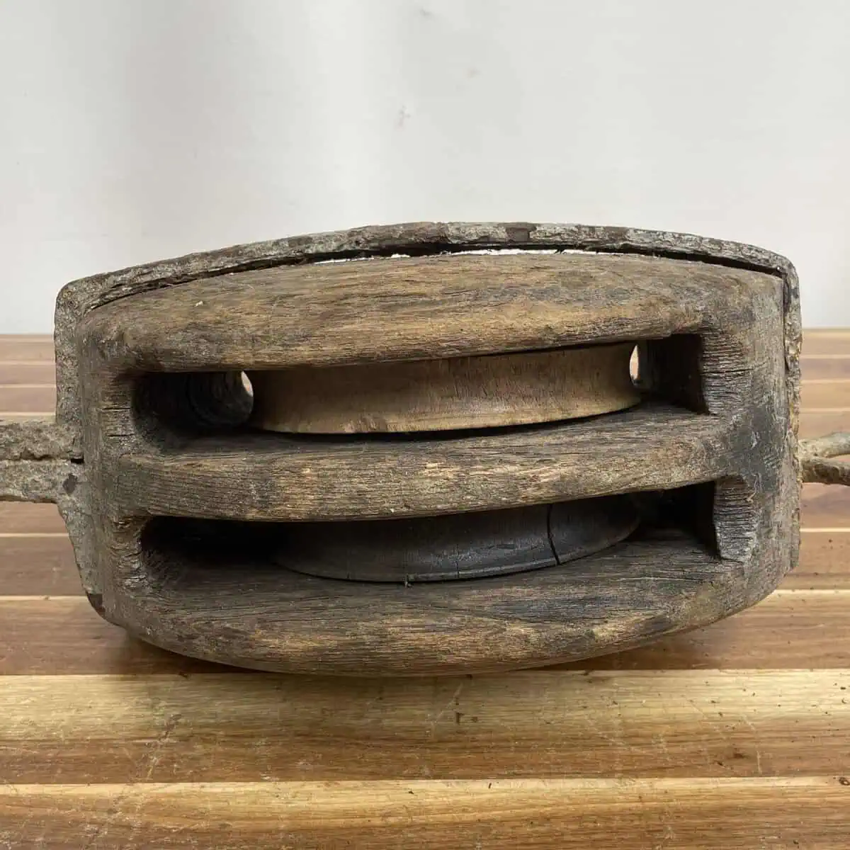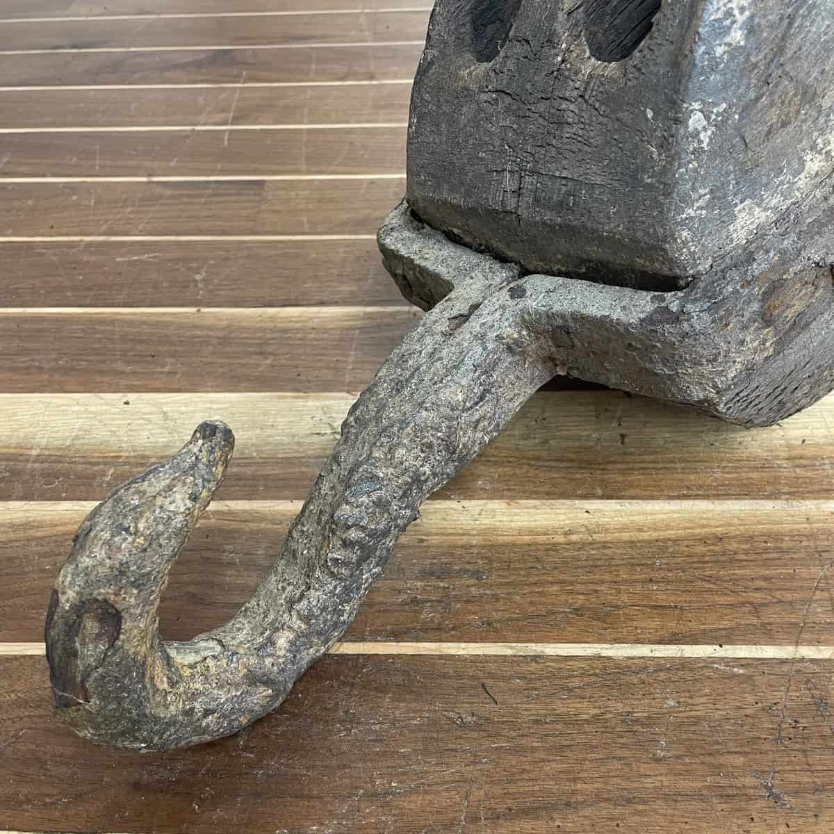 Great Lakes Salvaged Wood Ship Pulley – Double Block with Iron Hook, 21.5 lbs.