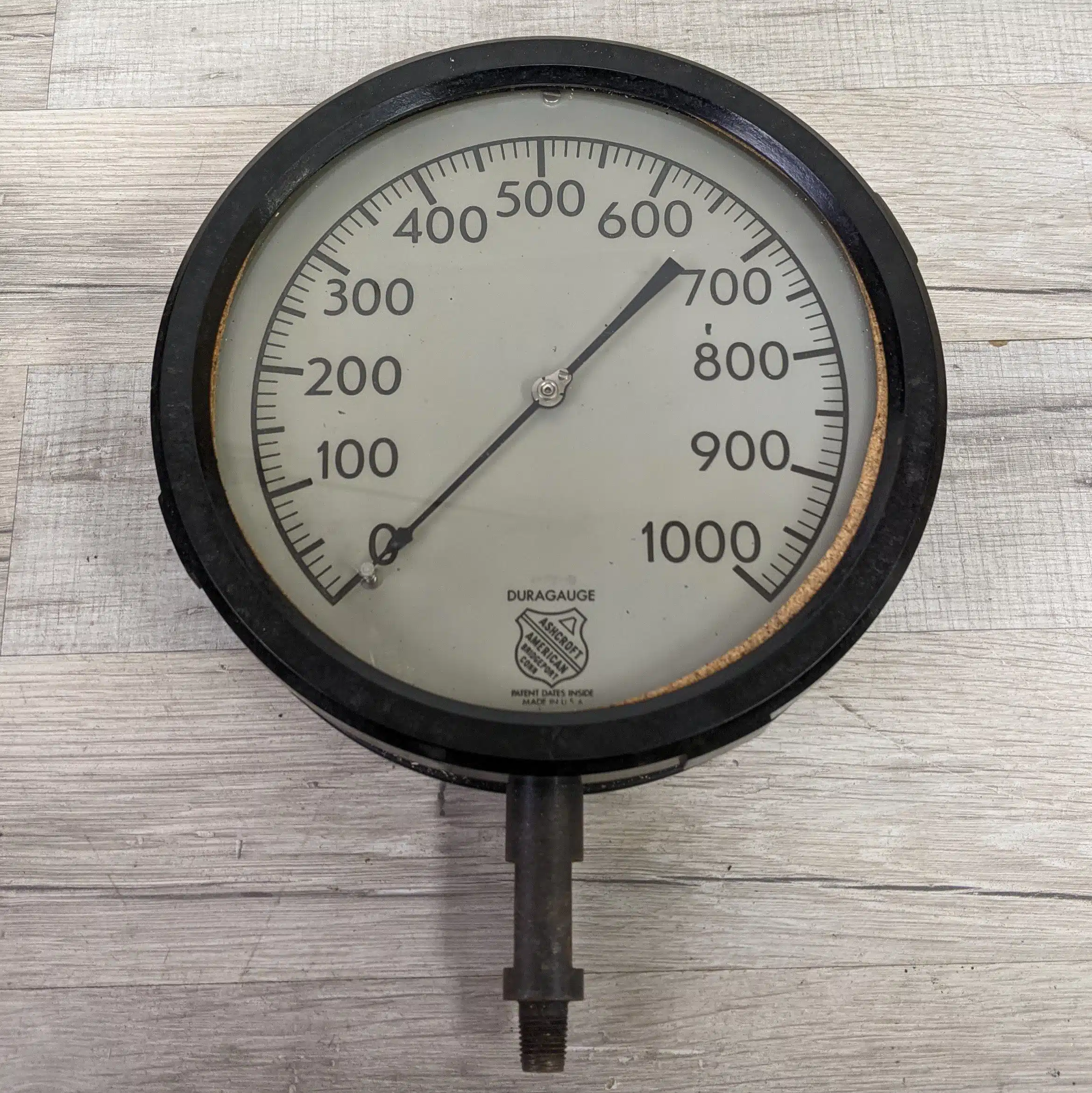 This is a 1940s Ashcroft Pressure Gauge with Original Testing Paperwork! This was manufactured in New York by the Ashcroft MFG. Co. While the housing is painted black, it is steel underneath. It reads up to 1,000 psi.