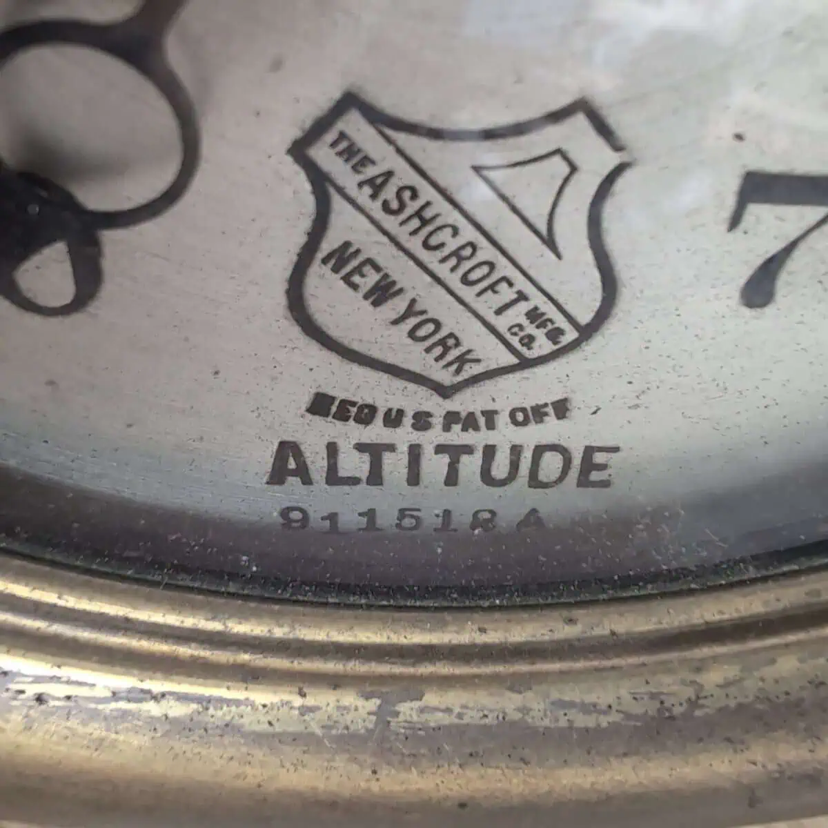 This altitude gauge has a patinaed brass top, with glass, attached to a brass base that has been painted black. The serial number for this pressure gauge is 911518A.