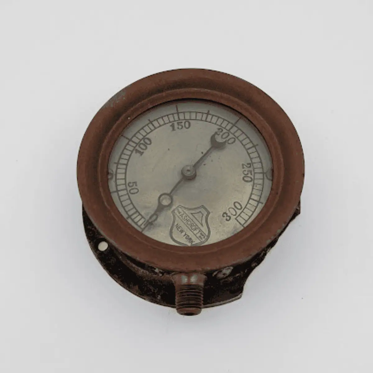 This antique Ashcroft pressure gauge reads from 0 to 300 and bears a mark that shows it to be from 1907 to 1929. The serial number on this gauge reads #15947.