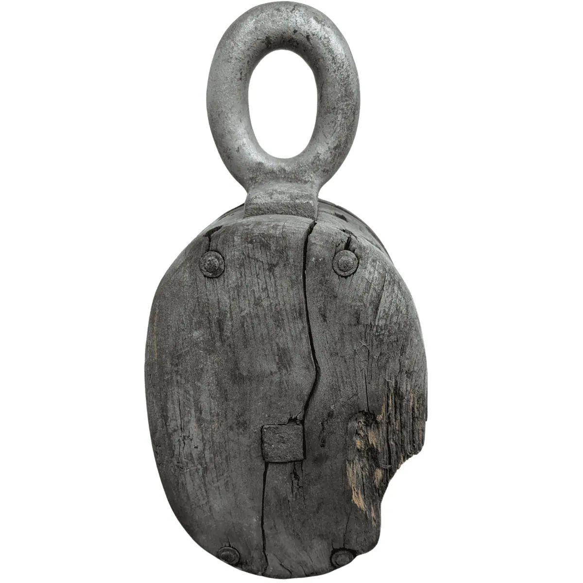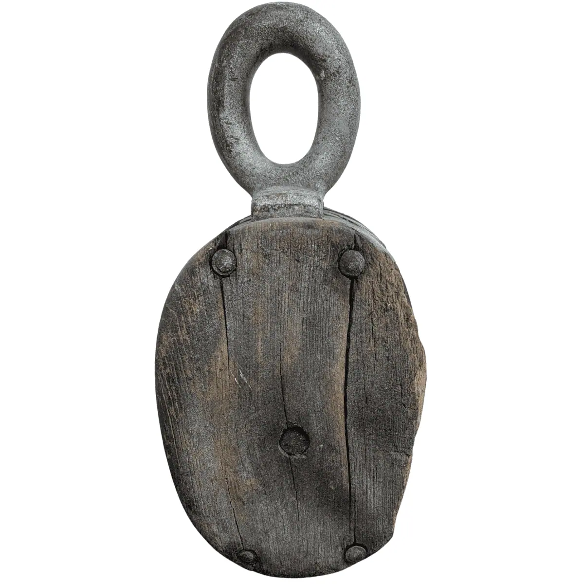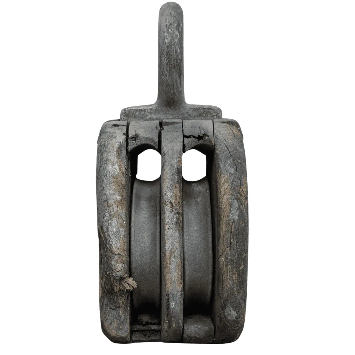 This vintage wooden pulley is a true piece of maritime history. Built for heavy-duty use, it once played a crucial role in rigging systems aboard ships. Featuring a solid iron loop at the top and two sheaves, this vintage wooden pulley has a classic, weathered look that makes it a standout decorative piece.