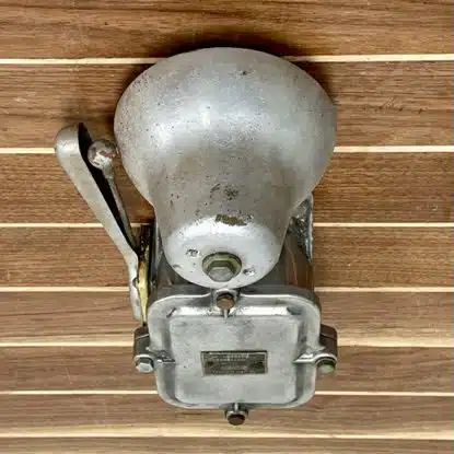 This particular Vintage Russian Alarm Ship Bell features a small faceplate with Russian characters. The housing is made of stainless, while the bell is aluminum. The overall condition is good, with some surface wear from actual use on a vessel. These bells were installed all over the ship and followed standard practices across the international maritime industry with various alarm signals, such as 7 short alarm rings followed by 1 long alarm ring signaling a general alarm and continuous ringing signaling a fire alarm.