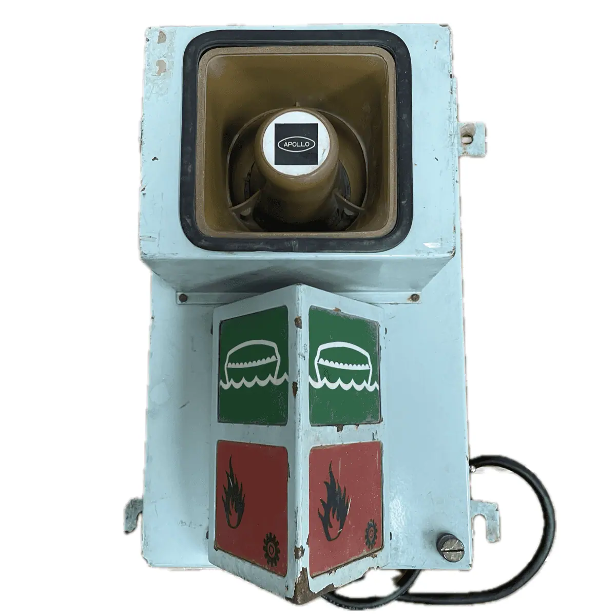 Decorate your room with this vintage fire alarm, salvaged from a lifeboat and rewired for modern use. The light blue base shows chipping paint and a worn green section near the switch adds character.