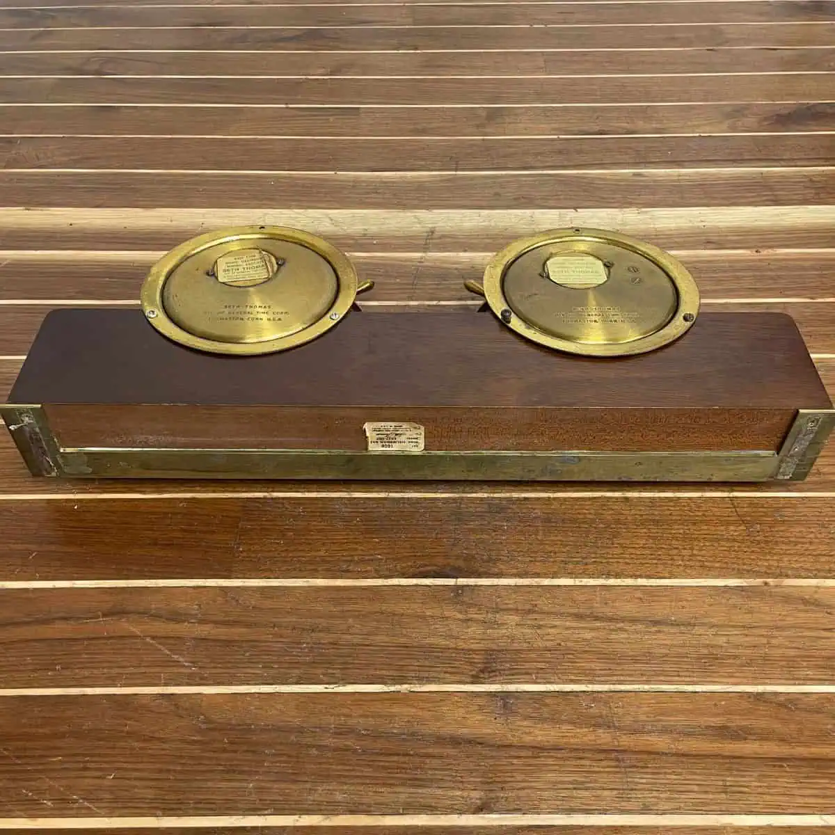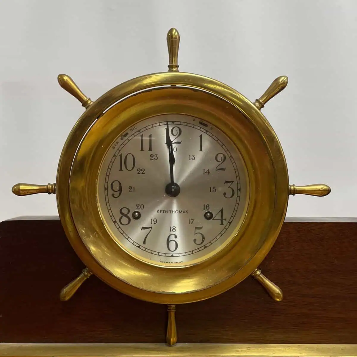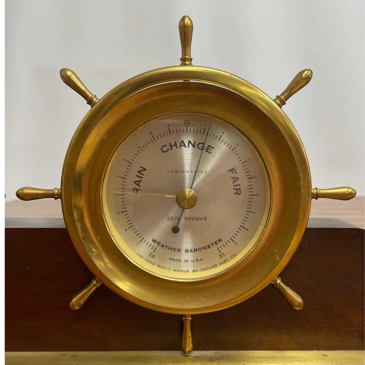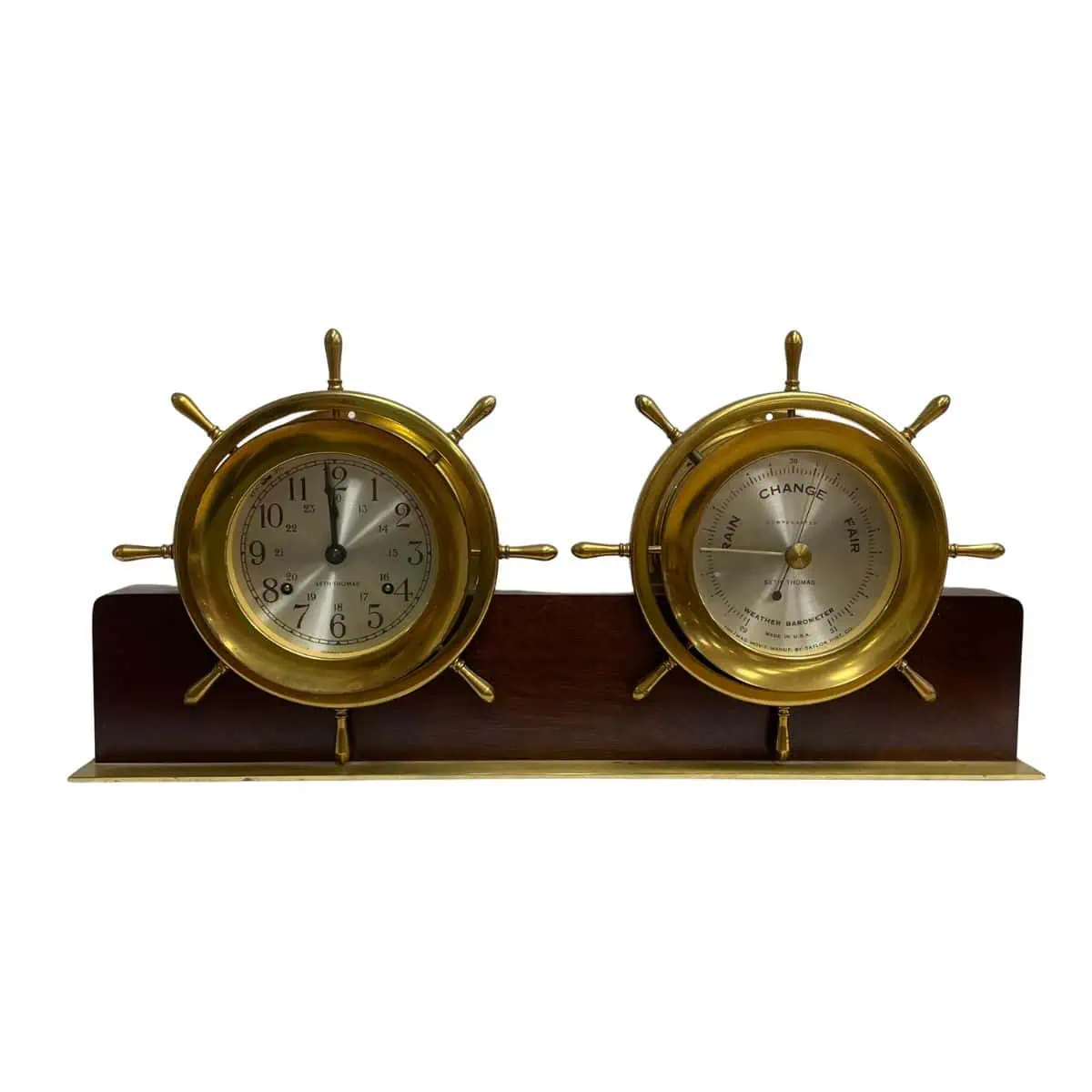 The Vintage Seth Thomas Helmsman 24-Hour Clock and Weather Barometer is a classic maritime instrument from a later production period. During this time, Seth Thomas Clock Company operated under Talley Industries, so this example reflects that era of manufacturing. In addition, the clock dial carries the Seth Thomas name, a detail consistent with their long-standing production.