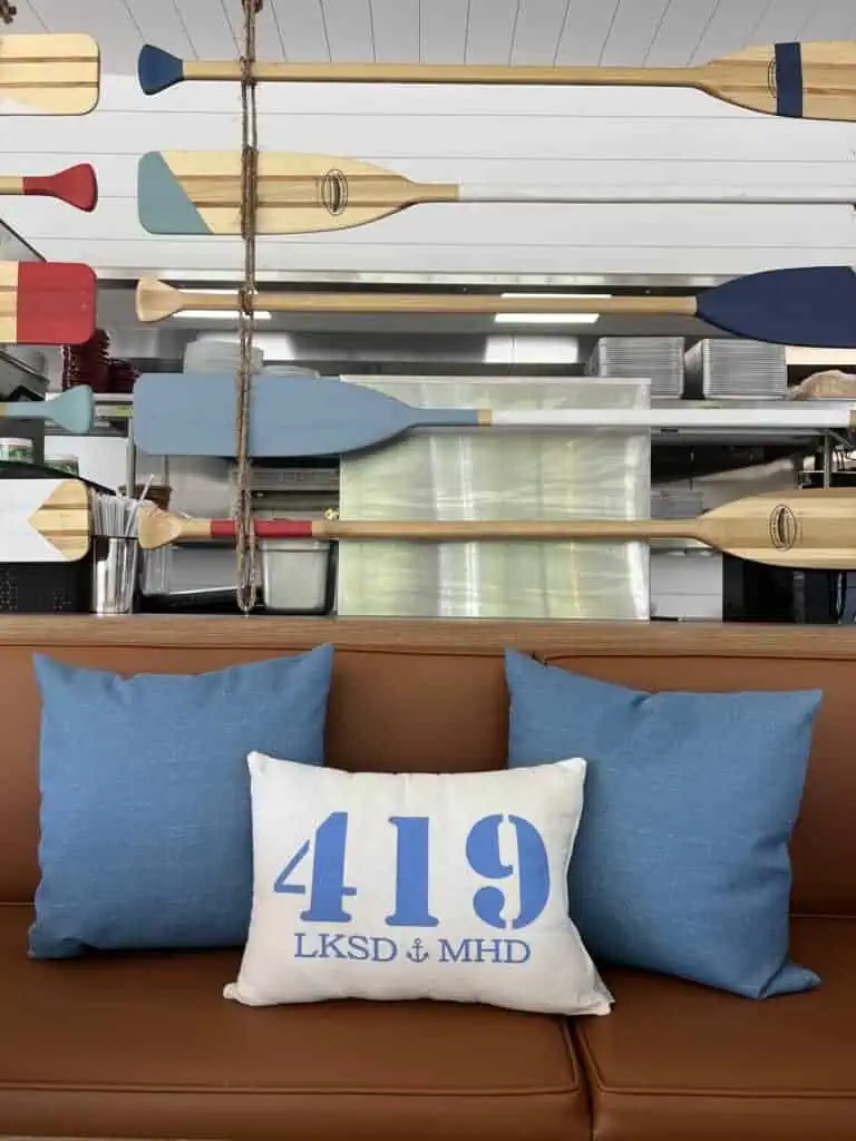 Restaurant owner, Gina Redinger, met us at the Catawba Island Boat Show a few years ago and fell in love with our items. Taking nautical creativity to the next level, Gina painted a handful of oars and then suspended them with rope vertically behind a couch in the restaurant. Alongside the oars, are some painted buoys to decorate the empty space in the staircase. If you live out in this area, or are just coming by to visit — make sure you stop out at Red’s Lake House for lunch after you visit Big Ship Salvage!